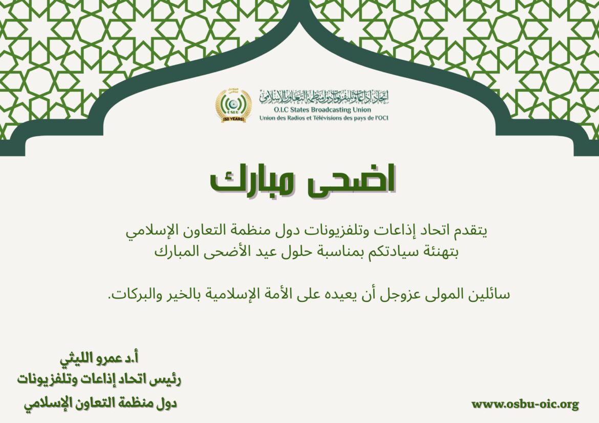يتقدم اتحاد إذاعات وتلفزيونات دول منظمة التعاون الإسلامي، برئاسة الأستاذ الدكتور عمرو الليثي، بأصدق التهاني وأطيب الأمنيات إلى شعوب أمتنا الإسلامية بمناسبة عيد الأضحى المبارك، أعاده الله علينا جميعًا بالخير واليُمن والبركات.
