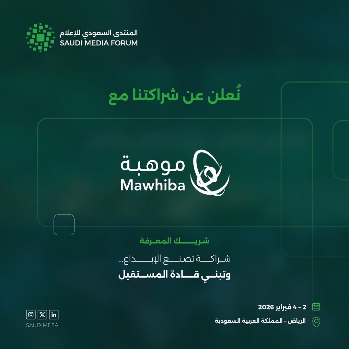 الرياض- واس /وقّع المنتدى السعودي للإعلام اتفاقية شراكة مع مؤسسة الملك عبدالعزيز ورجاله للموهبة والإبداع «موهبة»، لتكون شريك المعرفة للمنتدى في نسخته الخامسة، التي تُعقد في مدينة الرياض خلال الفترة من 2 إلى 4 فبراير 2026.وتتضمن الاتفاقية تنفيذ «موهبة» – بالشراكة مع المنتدى – ورشة عمل متخصصة تضم مجموعة مختارة …