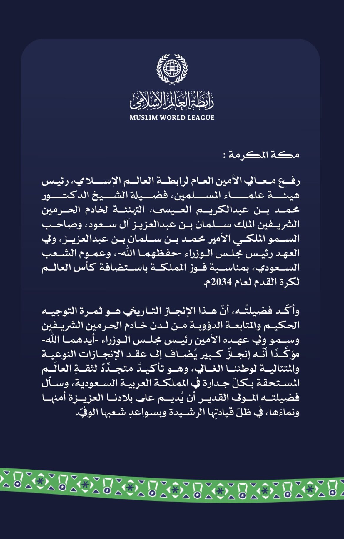 تهنئة من رابطة العالم الإسلامي بمناسبة فوز المملكة العربية السعودية باستضافة كأس العالم 2034