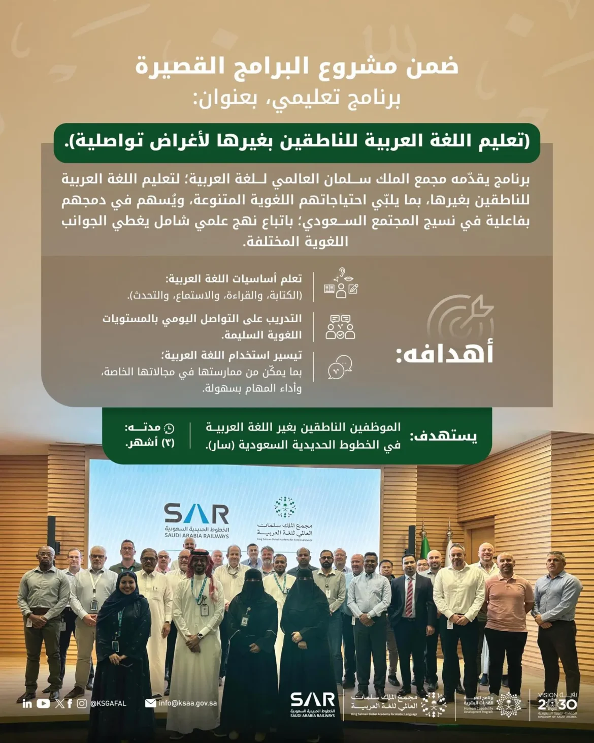 أطلق مجمع الملك سلمان العالمي للغة العربية برنامج “تعليم اللغة العربية للناطقين بغيرها لأغراض تواصلية”، بالتعاون مع الخطوط الحديدية السعودية “سار”، وذلك ضمن جهوده في دعم استخدام اللغة العربية في السياقات المهنية والتخصصية، وتعزيز حضورها في قطاعات العمل المختلفة؛ تحقيقًا لمستهدفات برنامج تنمية القدرات البشرية. وأكد الأمين العام للمجمع الدكتور …