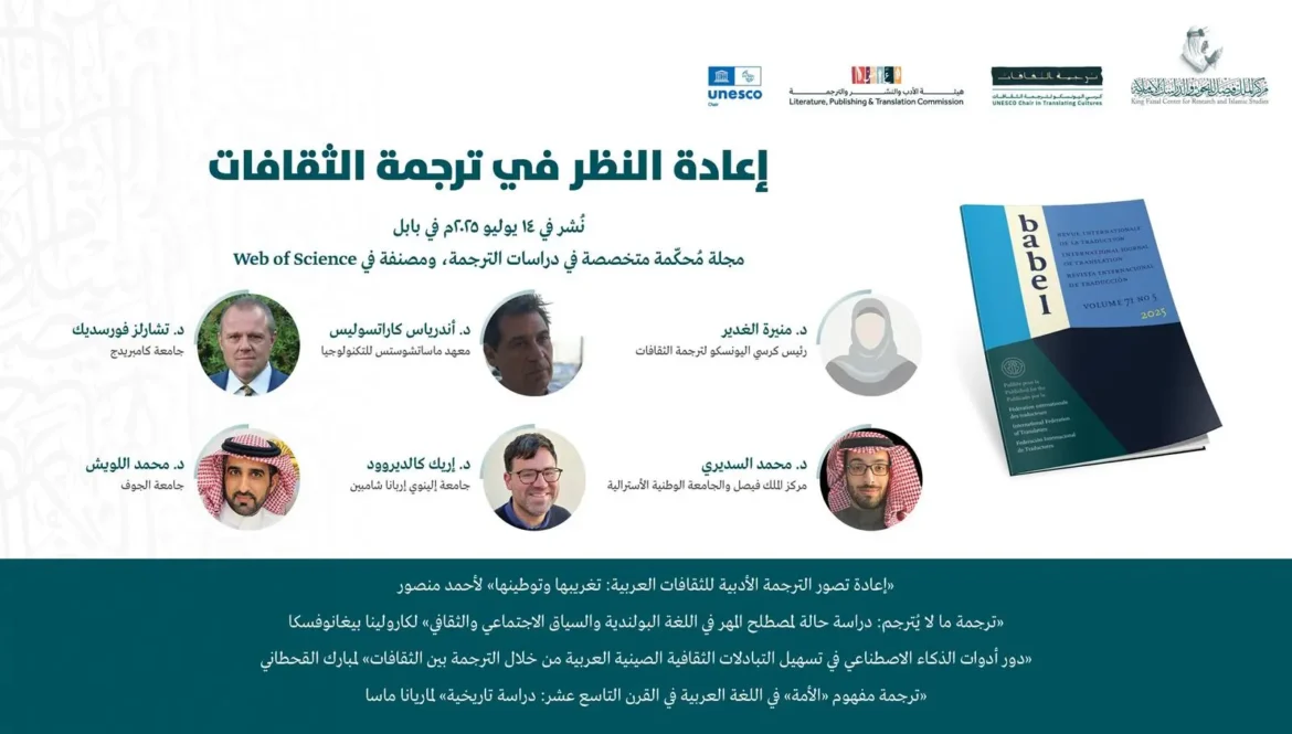 أصدر كرسيُّ اليونسكو لترجمة الثقافات في مركز الملك فيصل للبحوث والدراسات الإسلامية، بدعم من هيئة الأدب والنشر والترجمة، عددًا خاصًّا بعنوان: «إعادة النظر في ترجمة الثقافات» في 14 يوليو 2025م في مجلة بابل، وهي مجلة عالمية محكَّمة متخصصة في دراسات الترجمة. ويَستنِدُ هذا العدد على أكثر من أربعة عقودٍ من …
