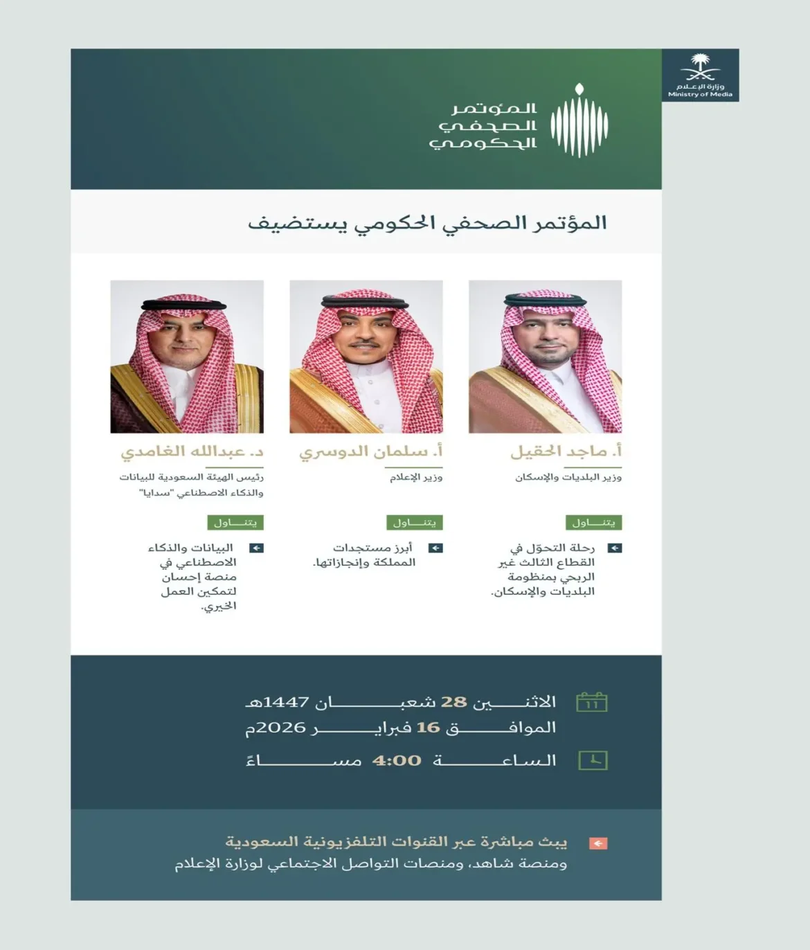 الرياض – الاثنين 16 فبراير 2026 تنطلق اليوم النسخة الثانية والثلاثون من المؤتمر الصحفي الحكومي بمدينة الرياض، والذي تنظمه وزارة الإعلام السعودية، مستضيفًا معالي وزير البلديات والإسكان الأستاذ ماجد بن عبدالله الحقيل، ومعالي وزير الإعلام الأستاذ سلمان بن يوسف الدوسري، ومعالي رئيس الهيئة السعودية للبيانات والذكاء الاصطناعي “سدايا” الدكتور عبدالله …