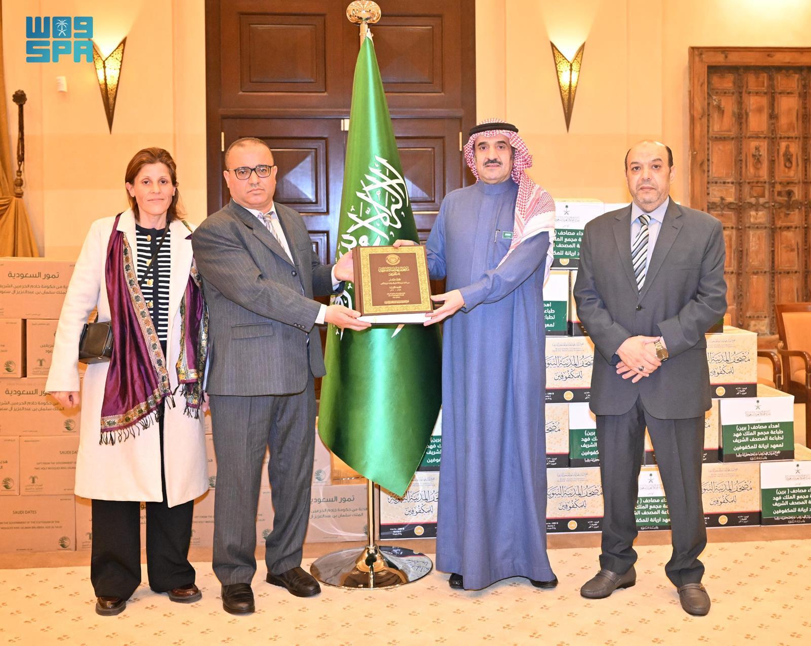 سلّم سفير خادم الحرمين الشريفين لدى تونس الدكتور عبدالعزيز بن علي الصقر مجموعة من المصاحف المطبوعة بطريقة برايل للاتحاد الجهوي للمكفوفين بمدينة أريانة، هدية من مجمع الملك فهد لطباعة المصحف الشريف.