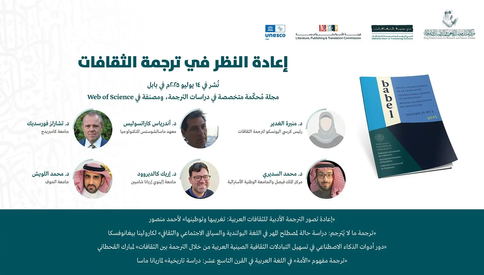 أصدر كرسيُّ اليونسكو لترجمة الثقافات في مركز الملك فيصل للبحوث والدراسات الإسلامية، بدعم من هيئة الأدب والنشر والترجمة، عددًا خاصًّا بعنوان: «إعادة النظر في ترجمة الثقافات» في 14 يوليو 2025م في مجلة بابل، وهي مجلة عالمية محكَّمة متخصصة في دراسات الترجمة.