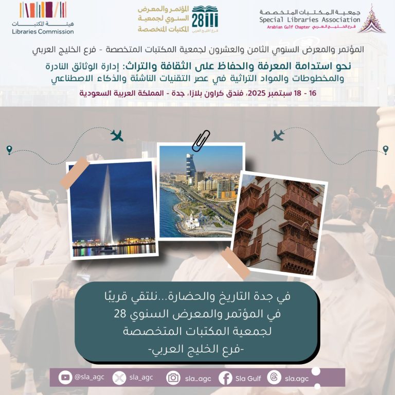 استعرض المشاركون في أعمال المؤتمر السنوي الثامن والعشرين لجمعية المكتبات المتخصصة -فرع الخليج العربي-, الذي انطلق أمس في جدة تحت عنوان “نحو استدامة المعرفة والحفاظ على الثقافة والتراث: إدارة الوثائق النادرة والمخطوطات والمواد التراثية في عصر التقنيات الناشئة والذكاء الاصطناعي”، أبرز التجارب البحثية والمبادرات العلمية التي تعكس تطور صناعة المعلومات ودورها في حفظ التراث وتعزيز الهوية الثقافية.