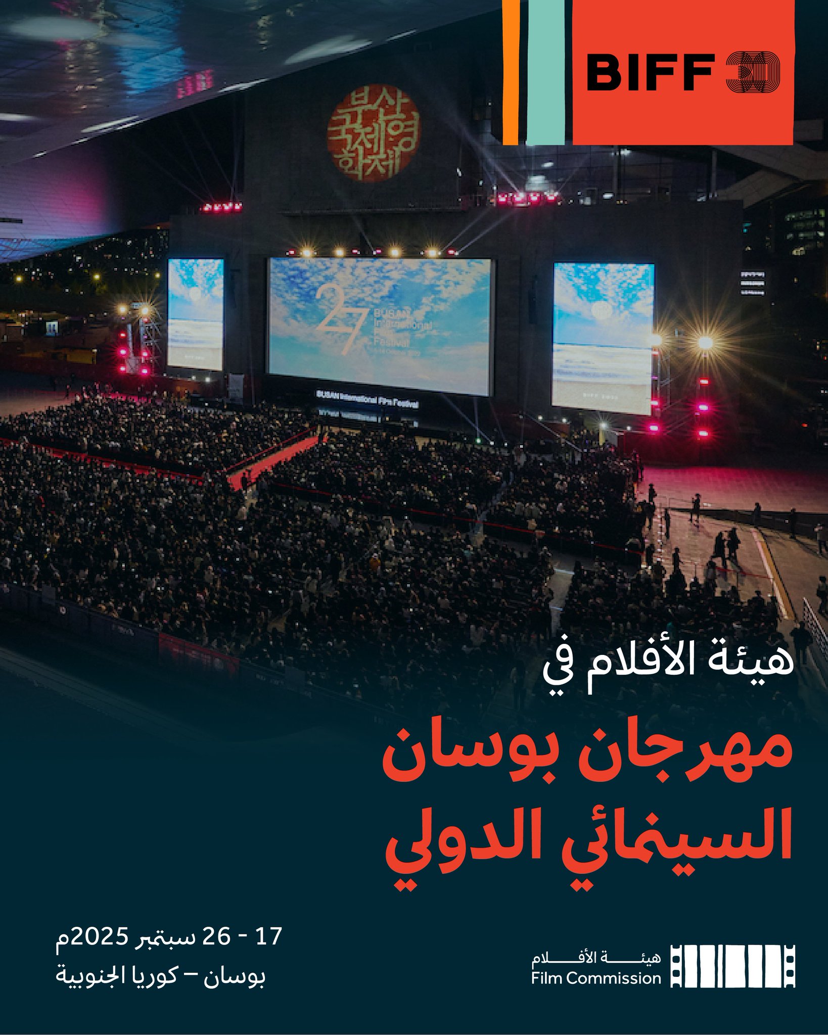 تشارك هيئة الأفلام في مهرجان بوسان السينمائي الدولي 2025، الذي يُقام في مدينة بوسان، ثاني أكبر مُدن كوريا الجنوبية، خلال الفترة من 17 إلى 26 سبتمبر، ويُعد المهرجان أحد أبرز المهرجانات السينمائية في قارة آسيا، ومن أكبر أسواق السينما على مستوى العالم، بما يقدمه من أقسام متنوعة للأفلام الروائية والوثائقية، ولدوره البارز في تسليط الضوء على المواهب الشابة الصاعدة في القارة.