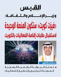 أعلن وزير الإعلام والثقافة ووزير الدولة لشؤون الشباب عبدالرحمن المطيري أن منصة “فيزت كويت” (Visit Kuwait) ستكون المنصة الرقمية الوحيدة المعتمدة لاستقبال طلبات الشركات المحلية والعالمية الراغبة في إقامة الفعاليات السياحية أو الثقافية أو الفنية أو الترفيهية في دولة الكويت.