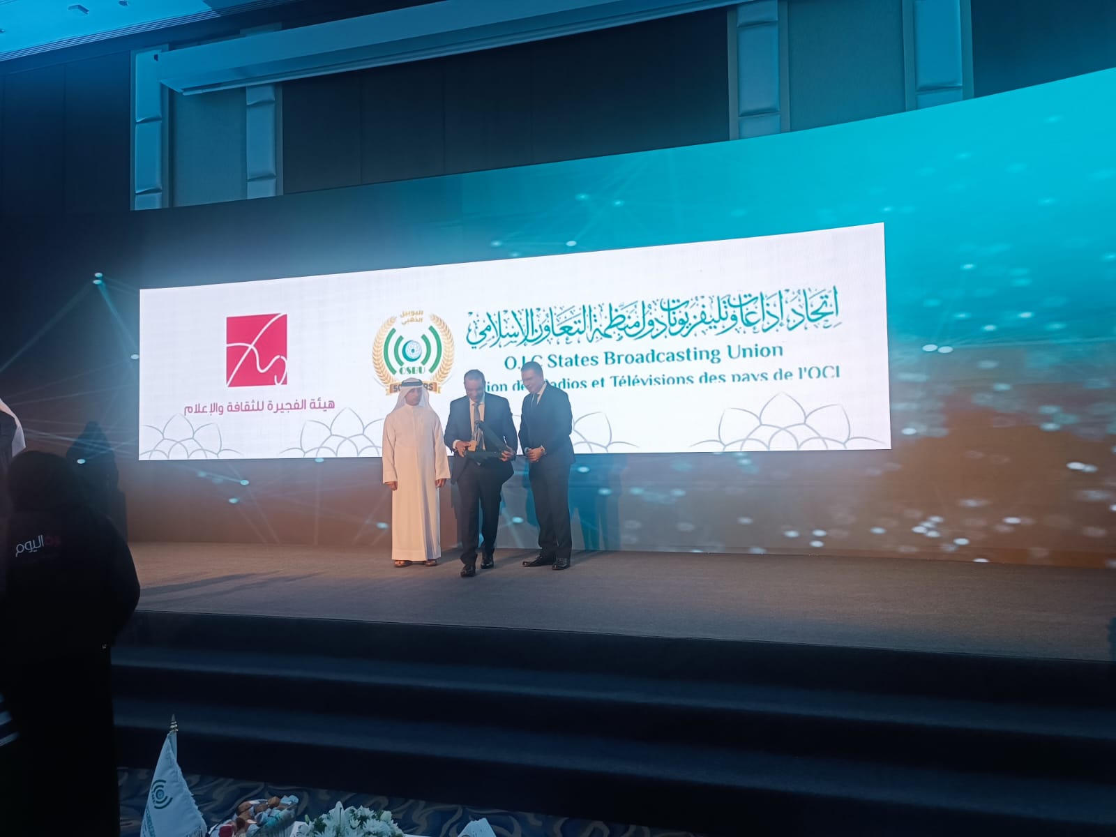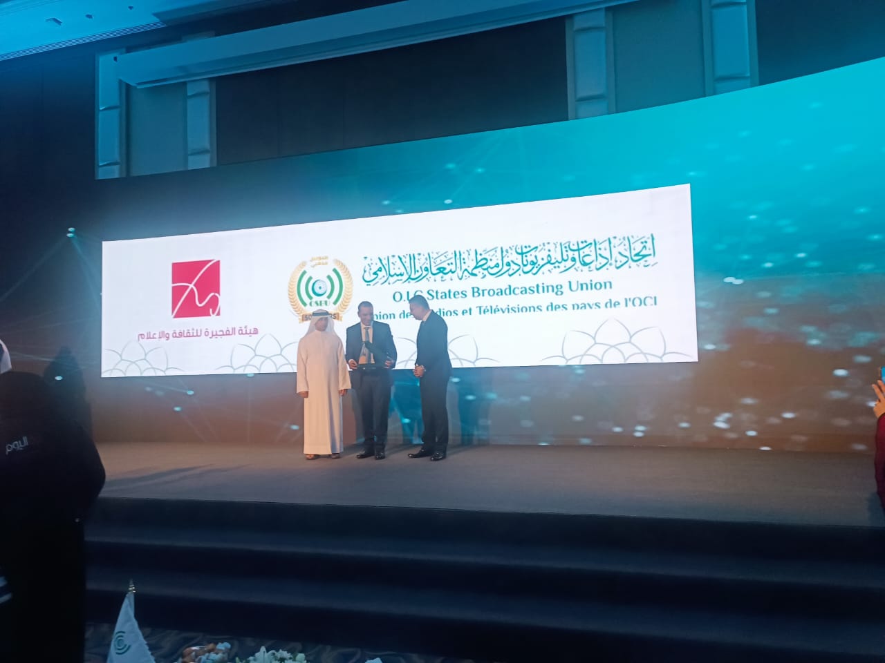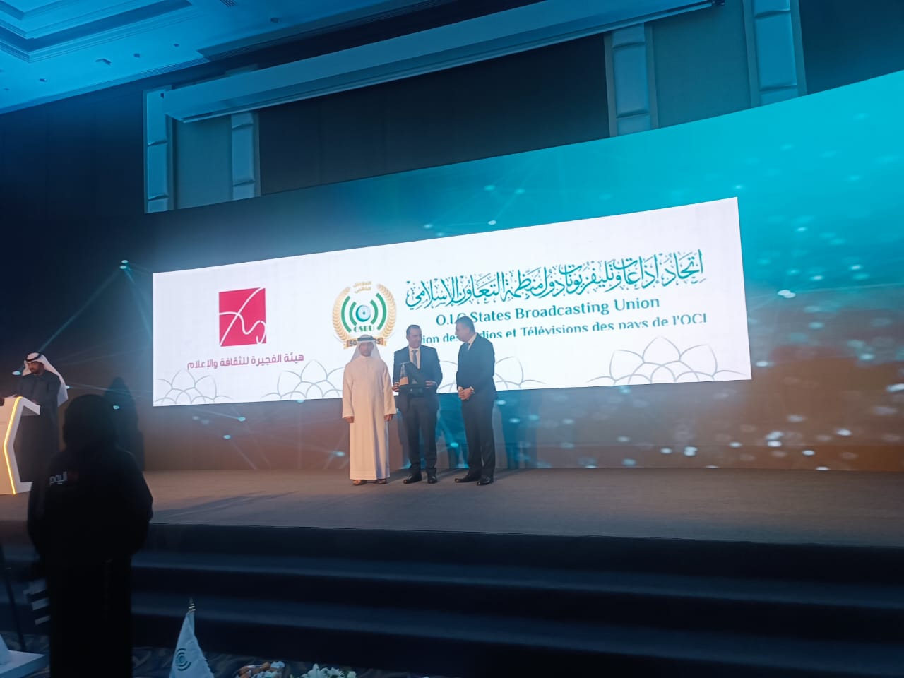 الفجيرة – شهد ملتقى اتحاد إذاعات وتلفزيونات دول منظمة التعاون الإسلامي لحظات تكريم بارزة لشخصيات إعلامية متميزة، حيث تم تكريم جمال شاكر من الأردن، وتسلم التكريم بالنيابة عنه الدكتور حكمت زريقات. كما تم تكريم الدكتور أحمد نعينع وحسن علي سليمان، وتسلم التكريم بالنيابة عنهما الأستاذ إسماعيل دويدار، رئيس إذاعة القرآن الكريم.