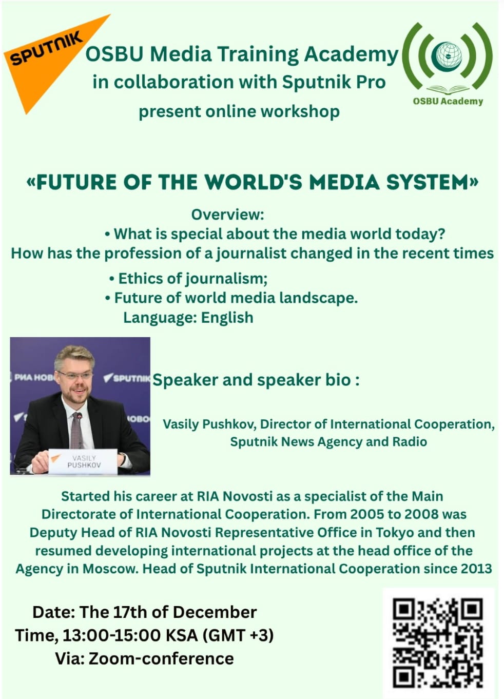 تنظم أكاديمية OSBU للتدريب الإعلامي، بالتعاون مع وكالة سبوتنيك، ورشة عمل إلكترونية بعنوان “مستقبل نظام الإعلام العالمي”، يوم الثلاثاء 17 ديسمبر 2025، عبر منصة Zoom، من الساعة 13:00 حتى 15:00 بتوقيت المملكة العربية السعودية (GMT+3).