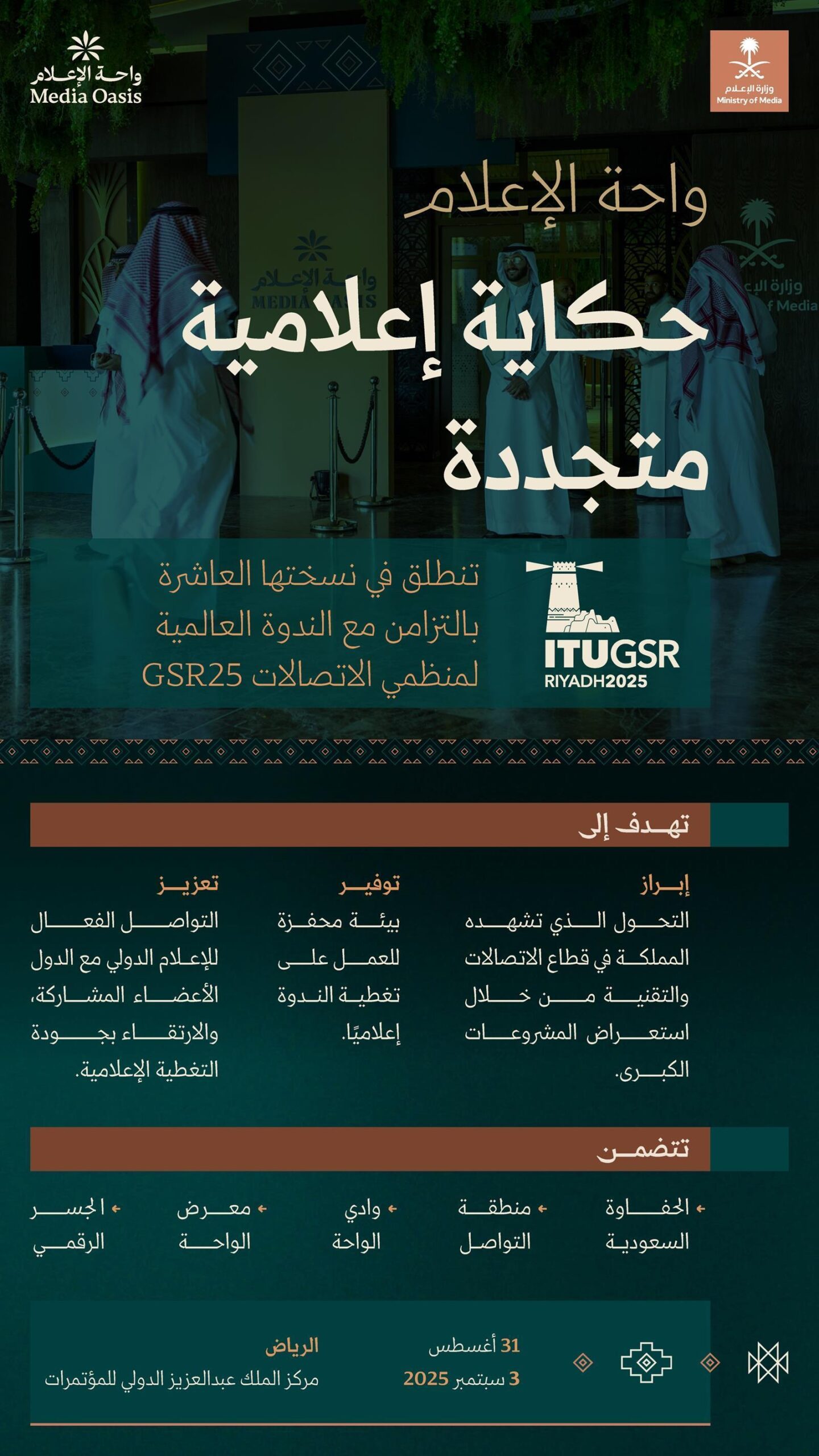 أعلنت وزارة الإعلام السعودية عن إقامة النسخة العاشرة من «واحة الإعلام»، بالتزامن مع الندوة العالمية لمنظمي الاتصالات (GSR25)، وذلك خلال الفترة من 31 أغسطس إلى 3 سبتمبر 2025 في مركز الملك عبدالعزيز للمؤتمرات بمدينة الرياض. وتأتي هذه الفعالية ضمن إنجازات وزارة الإعلام لعام 2025، برعاية معالي وزير الإعلام السعودي، سلمان بن يوسف الدوسري، تعزيزًا لمكانة المملكة في المحافل الإعلامية الدولية.