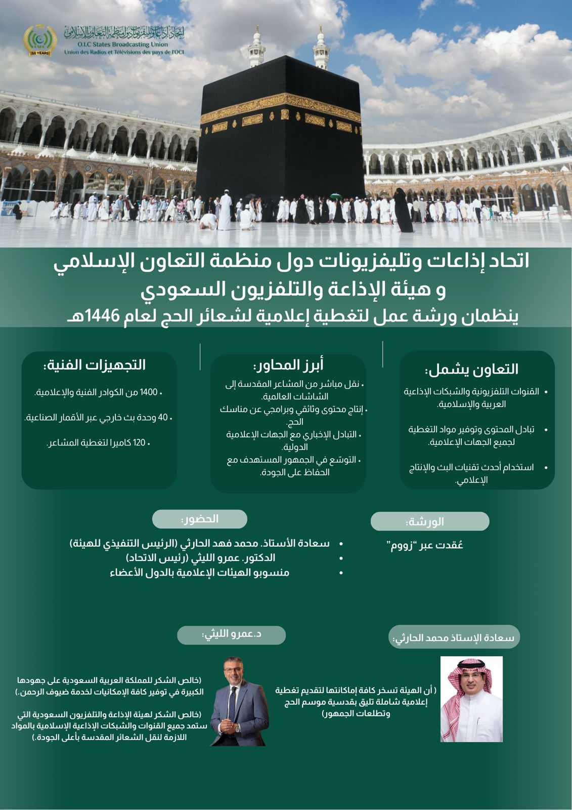 نظّم الاتحاد ورشة عمل إعلامية لأعضائه خلال موسم حج 1446هـ، بالتعاون مع هيئة الإذاعة والتلفزيون السعودية، حيث تم إرسال إشارات بث موسم الحج إلى الدول الأعضاء، إلى جانب إهداء مواد إعلامية لدعم التغطية المهنية لهذه الشعيرة العظيمة.