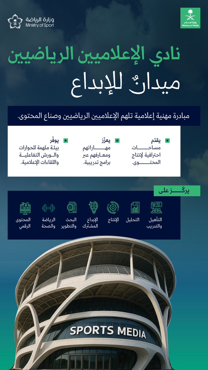 أطلقت وزارة الإعلام السعودية بالتعاون مع وزارة الرياضة السعودية مبادرة «نادي الإعلاميين الرياضيين»، التي تهدف إلى تمكين الإعلاميين الرياضيين وصناع المحتوى وتطوير مهاراتهم المهنية، عبر تقديم برامج تدريبية وورش عمل تفاعلية.