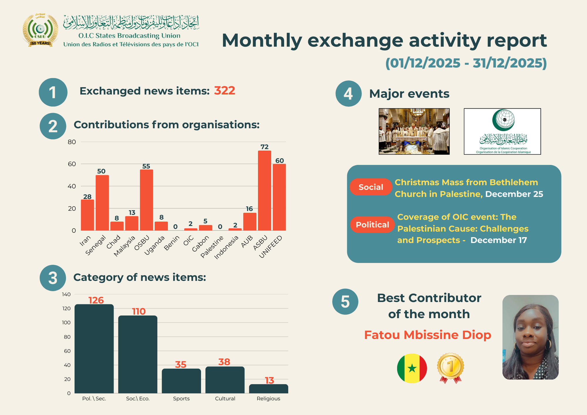 وخلال شهر ديسمبر 2025، سجلت التبادلات الإخبارية والبرامجية مستوىً إيجابيًا من المشاركة، حيث برزت السيدة فاتو أمبيسين ديوب (Fatou Mbissibine Diop)، منسقة هيئة الإذاعة والتلفزيون السنغالية، من خلال جهودها المهنية ومشاركاتها المنتظمة، بما انعكس بصورة إيجابية على نشاط التبادل الإخباري والبرامجي خلال تلك الفترة.