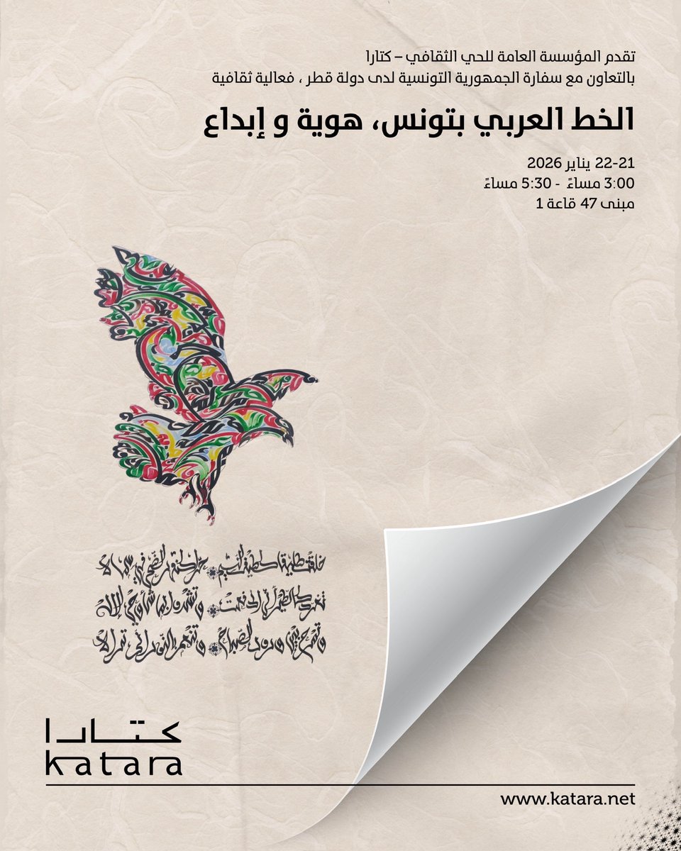 وتنظم كتارا هذه الفعالية بالتعاون مع سفارة الجمهورية التونسية لدى دولة قطر، وتستمر على مدار يومي 21 و22 يناير الجاري، في إطار تعزيز التبادل الثقافي العربي والاحتفاء بجماليات الخط العربي ودوره في التعبير عن الهوية.