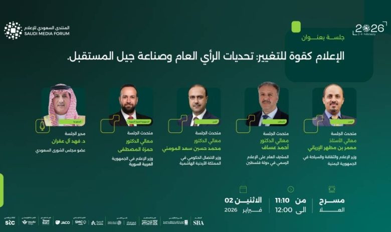 يشارك عدد من وزراء الإعلام العرب في جلسة حوارية بعنوان «الإعلام كقوة للتغيير.. تحديات الرأي العام وصناعة جيل المستقبل»، ضمن أعمال النسخة الخامسة من المنتدى السعودي للإعلام 2026، الذي ينطلق يوم الاثنين المقبل تحت شعار «الإعلام في عالم يتشكل»، وذلك في فندق هيلتون بالعاصمة الرياض.