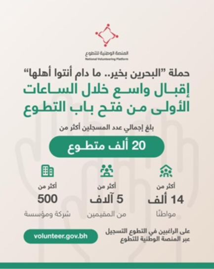 في مشهد وطني يجسّد أصالة المجتمع البحريني وتماسكه، شهدت الساعات الأولى من فتح باب التسجيل للتطوع ضمن حملة “البحرين بخير.. ما دام أنتوا أهلها” عبر المنصة الوطنية للتطوع إقبالًا واسعًا، عكس روح المسؤولية المشتركة والانتماء الصادق لهذا الوطن المعطاء من المواطنين والمقيمين على حد سواء.