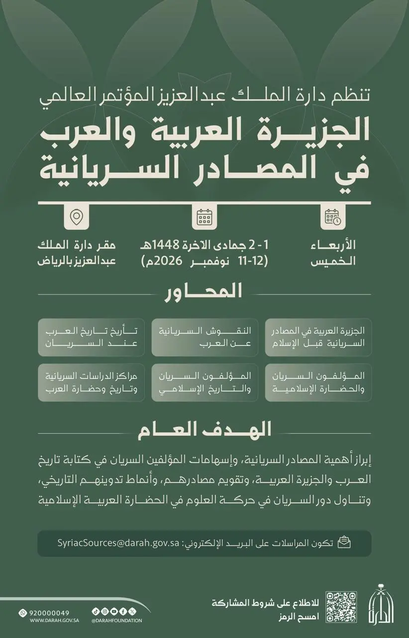 الرياض – أعلنت دارة الملك عبدالعزيز عزمها تنظيم مؤتمر عالمي بعنوان “الجزيرة العربية والعرب في المصادر السريانية”، الذي سيعقد يومي 1–2 جمادى الآخرة 1448هـ الموافق 11–12 نوفمبر 2026م، ضمن برامجها العلمية الرامية لتعميق البحث في مصادر تاريخ الجزيرة العربية وتوسيع دائرة الدراسات المقارنة في تاريخ العرب من خلال المدونات غير العربية.