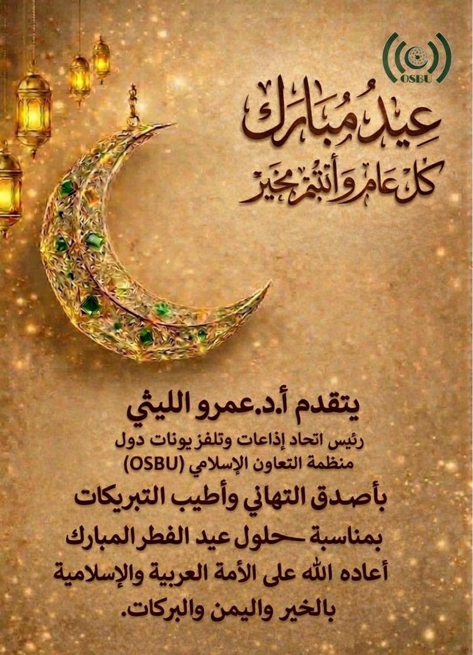 قدم اتحاد إذاعات وتلفزيونات دول منظمة التعاون الإسلامي، برئاسة د. عمرو الليثي، التهاني للأمة الإسلامية بمناسبة حلول عيد الفطر المبارك، متمنياً أياماً مباركة مليئة بالسلام والخير للمسلمين في جميع أنحاء العالم.