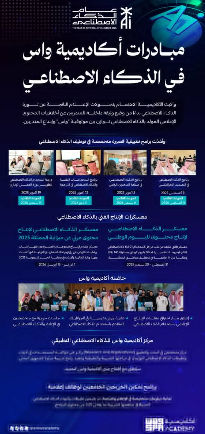 تواصل أكاديمية واس التابعة لوزارة الإعلام السعودية تنفيذ برامج ومعسكرات تدريبية متخصصة في الذكاء الاصطناعي خلال عام 2026، بهدف تمكين الكفاءات الوطنية الإعلامية وتطوير مهاراتها في توظيف التقنيات الحديثة في الإعلام.