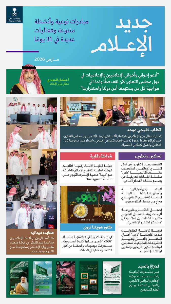 أكد معالي وزير الإعلام السعودي أن قطاع الإعلام شهد خلال 31 يومًا تنفيذ مبادرات نوعية وأنشطة متنوعة وفعاليات عديدة ضمن مسار “جديد الإعلام”، بما يعزز التطوير والتحديث في المحتوى الإعلامي الخليجي.