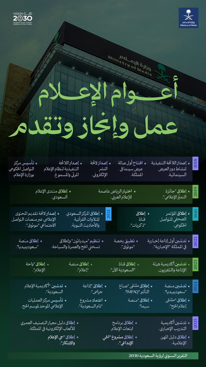 تواصل وزارة الإعلام السعودية تحقيق إنجازات نوعية ومتسارعة ضمن مستهدفات رؤية السعودية 2030، في إطار جهودها لتطوير قطاع إعلامي حديث، تنافسي، وقادر على مواكبة التحولات الرقمية العالمية.